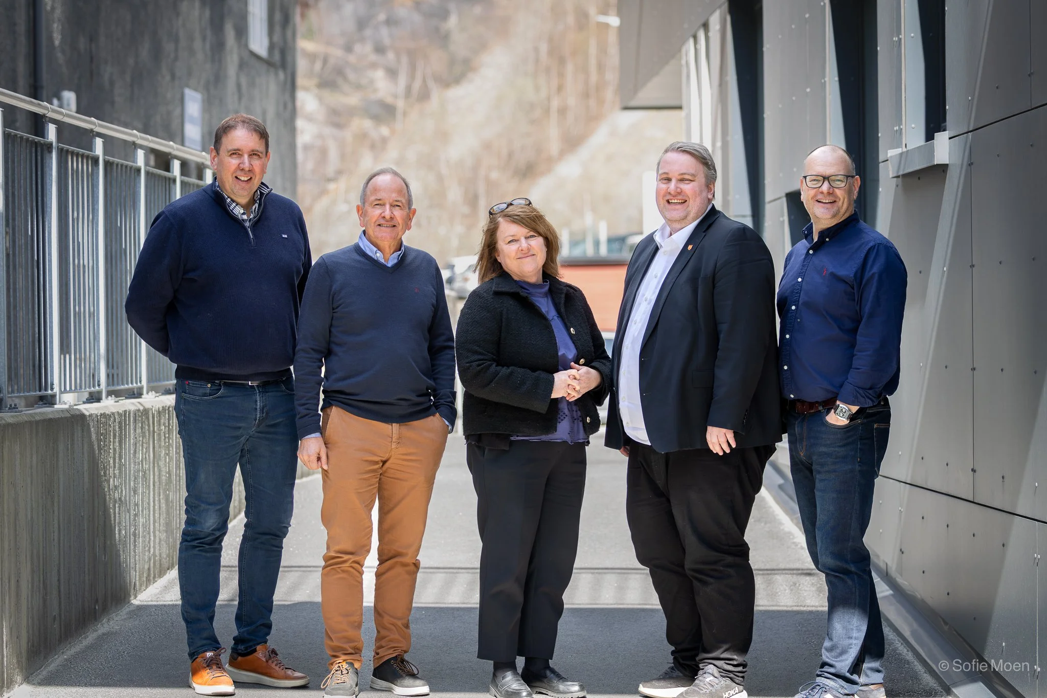 Arbeidsgruppa som har arbeidd med omstillingssøknaden: Harald Husabø (BDO), Are Indrelid (Årdal Teknologipark), Mette Hestetun Berg (kommunedirektør), Christian Sønstlien (ordførar) og Geir Hansen (Årdal Utvikling). Ikkje til stades: Jan Stian Smedegård (Årdal Energi). Foto: Sofie Moen.